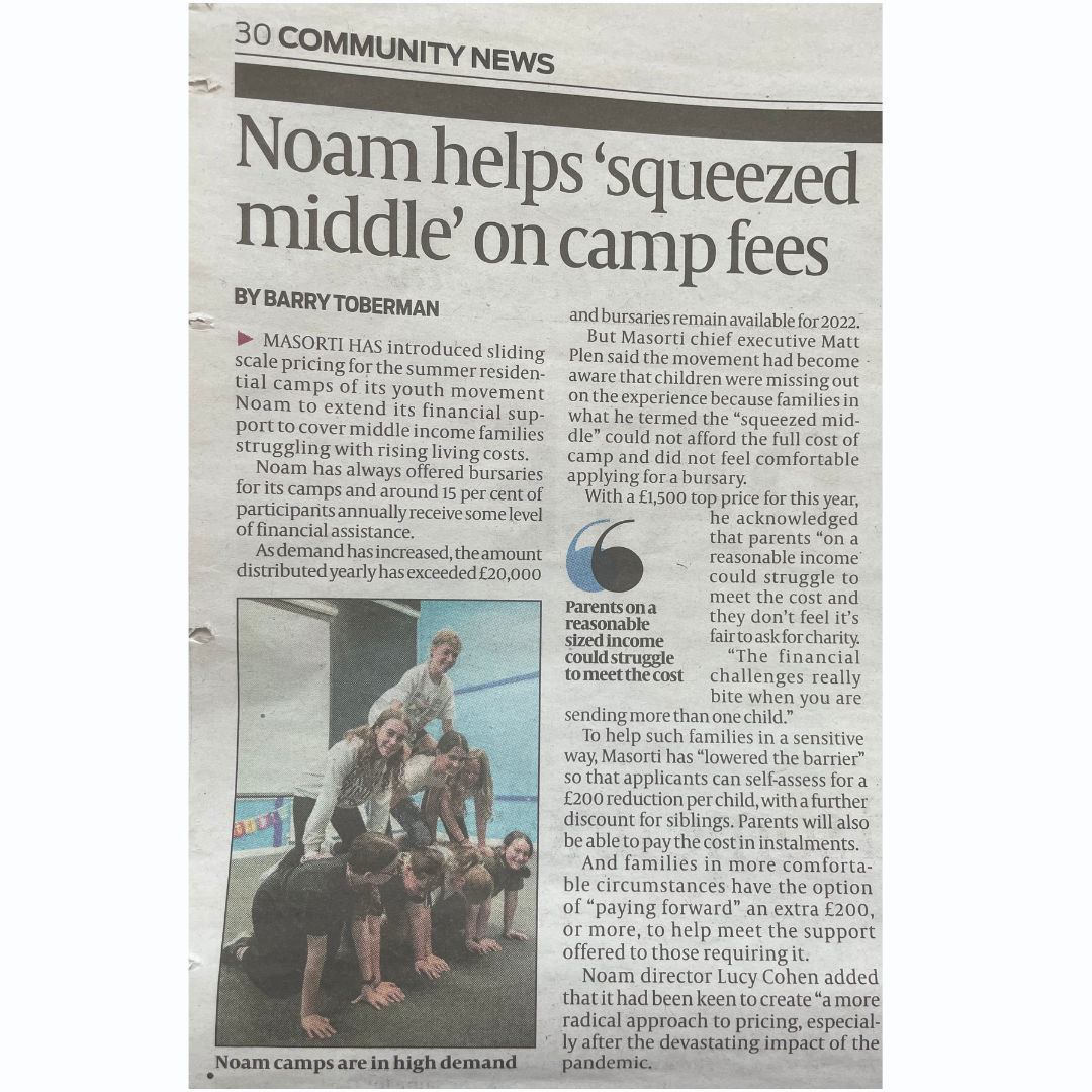 Noam Director Lucy Cohen said: “We wanted to create a more radical approach to pricing especially after the devastating impact of the pandemic. This new structure is guided by our values of gemillut hasadim (acts of loving-kindness) and kehilla (community). We hope that families who can will take the opportunity to support their neighbours and Noam’s subsidy fund. We also wanted to make it as easy as possible for people to access financial support in a way that protects their dignity above all. As somebody who could only access Noam as a child because of the generosity of subsidies I understand how important it is for all young people to access Noam’s transformational programming. This change will ensure that we can continue changing lives in a way that matches our core principles.”